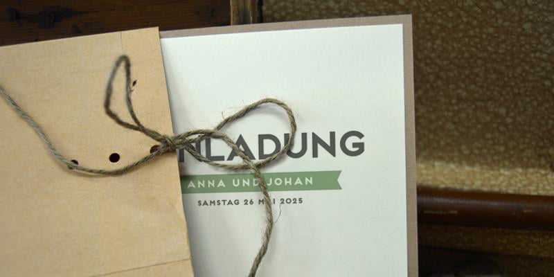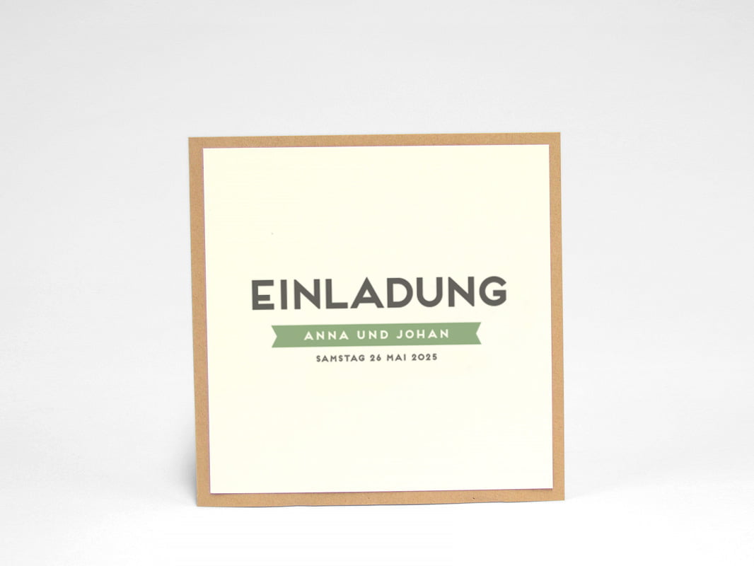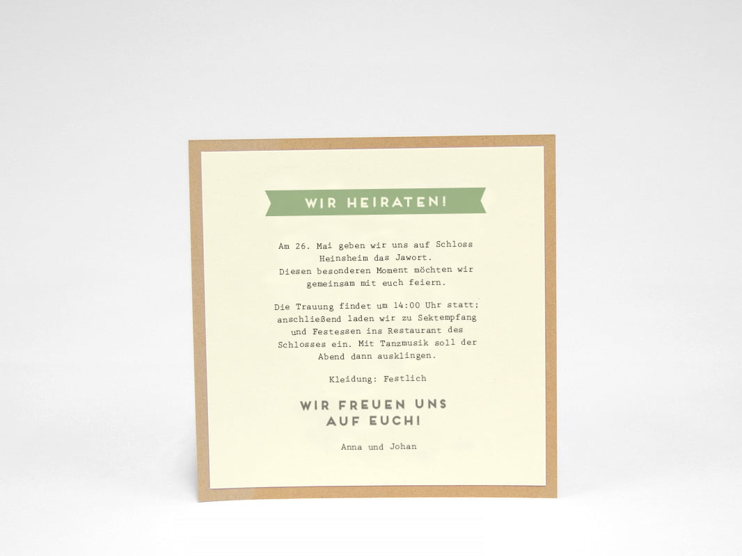 Die Hochzeitseinladung Österlen Vintage drucken wir auf edles cremefarbenes Papier, das wir auf braunes Recyclingpapier montieren. Dadurch erhält die Einladungskarte einen hübschen Rahmen und einen natürlichen Charakter.
